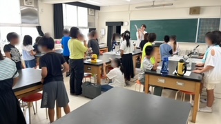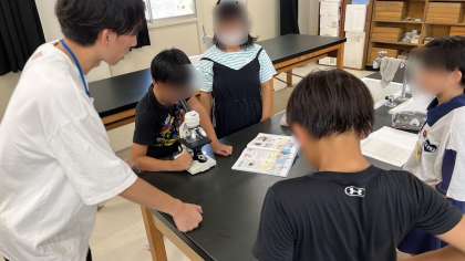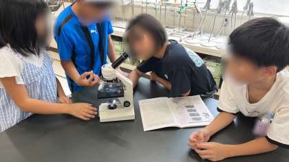 理科の学習です。かぼちゃの花のめしべやおしべなどを顕微鏡で観察していました。顕微鏡の使い方を班のみんなで確認しながら進めていました。