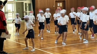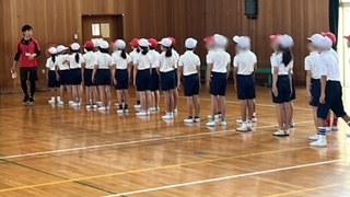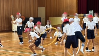 体育の学習です。先生の指示に応じて素早く集合して並んだり、隊列を変えたり、集団行動の学習をしました。その後、輪を使ったゲームで体を動かしていました。