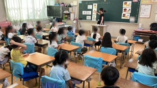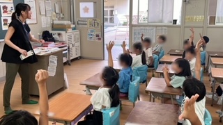 1年生の様子です。他校から栄養教諭に来ていただいての栄養指導の時間でした。食べ物を栄養素別にグループ分けし、どのグループの食品も好き嫌いなく食べられるよう頑張ろうというお話に、子どもたちはしっかりと耳をかたむけていました。