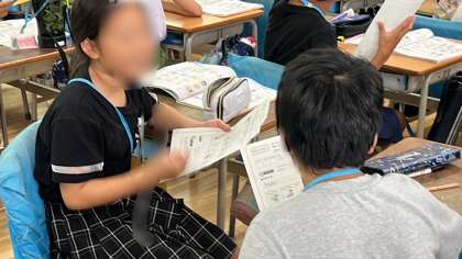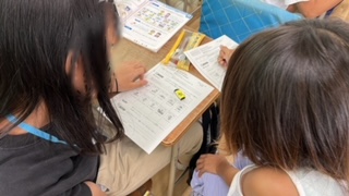 英語学習の様子です。プリントにまとめた質問を友だち同士で話し合っていました。