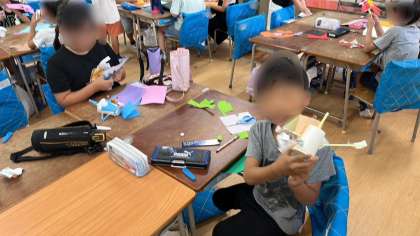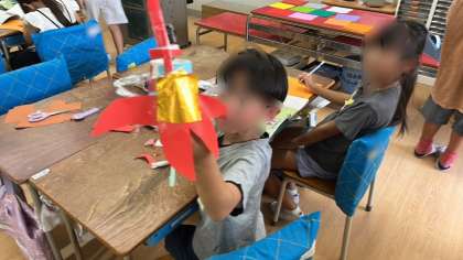 図工で、紙コップとストローを使った動くオモチャ作りです。それぞれが工夫を凝らした作品が出来上がっていました。