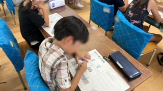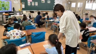他校から栄養教諭さんを招いての栄養指導です。今日は、野菜の種類や栄養などについて学習しました。プリントに沿って学習を進めていました。