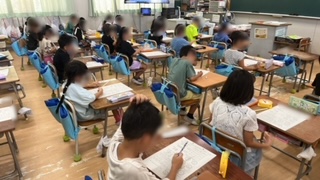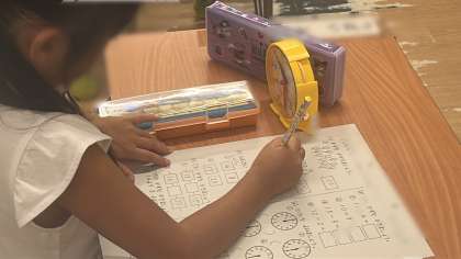 算数の学習です。時計の見方の単元テストに取り組んでいました。時計の模型を使ってもいいことになっていました。みんな、頑張って!