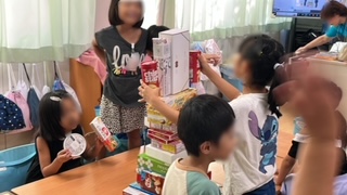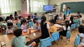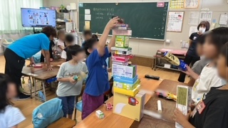 算数の学習で「かたちあそび」の単元です。家から持ってきていろんな形の箱を使って、積み上げて高さ比べをしました。どんな形や大きさの箱を土台にしたら安定するのか、班のみんなで考えながら進めました。