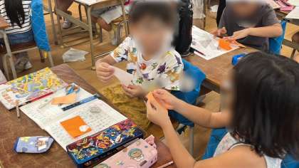 算数の図形の学習です。正方形の特徴を長方形との比較から考えていました。実際に色紙で正方形をつくり、それを見ながら周りの友だちと意見交換していました。