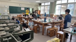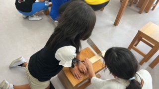 図工の学習です。ノコギリを使っての木工に取り組んでいました。ノコギリを使うのは今日が初めてという子がたくさんいました。協力して取り組んでいる子たちもいました。