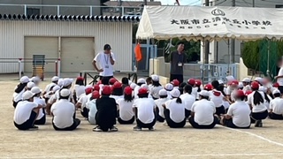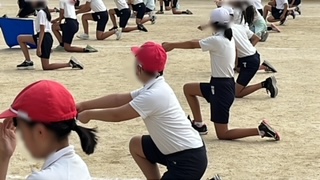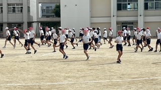 運動会練習です。運動場で隊形の確認をしていました。この後、体育館で動きの練習もする予定です。