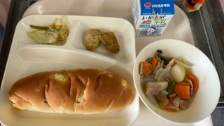 今日の献立は、鶏肉のカレー風味焼き、スープ煮、野菜のソテー、おさつパン、牛乳です。いただきます。