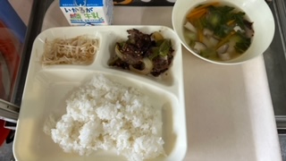 今日の献立は、プルコギ、トック、もやしのナムル、ご飯、牛乳です。いただきます。