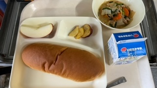 今日の献立は、中華煮、大学芋、りんご、黒糖パン、牛乳です。いただきます。