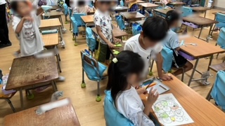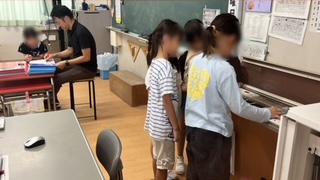 休み時間の様子です。雨天で運動場が使えないので、教室等で工夫して過ごしていました。お絵描きをしたりオルガンを弾いたり、集まっておしゃべりをしたりめいめいで楽しく過ごしていました。