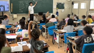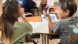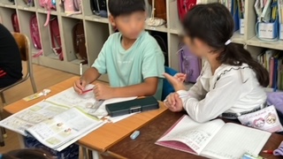 社会科の学習です。商店街とスーパーの違いから商店街の特徴について考えていました。近くの友だちとも意見交換をして違いを見つけていきました。