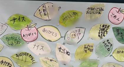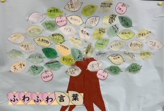 言われた時、気持ちがよくなる言葉「ふわふわ言葉」を集めた木です。3年生の教室に生えていました。