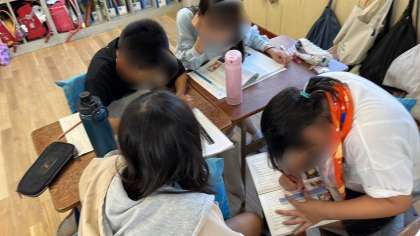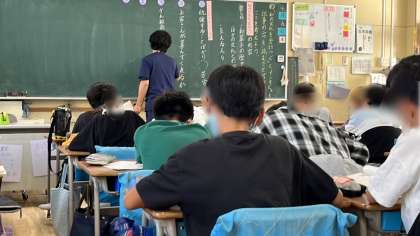 国語の学習です。和の文化について、説明文と和菓子職人へのインタビューとを読んで文化を受け継ぐということについて考えました。班で意見交換をして考えを深めていました。