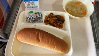 今日の献立は、ナスのミートグラタン、鶏肉とキャベツのスープ、ミニフィッシュ、黒糖パン、牛乳でした。ごちそうさまでした。