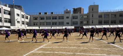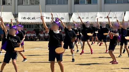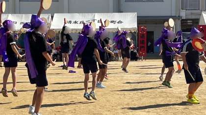 4年生の団体演技「島人ぬエイサー がんばるサー」です。音楽にあった心のこもった踊りにとても感動しました。