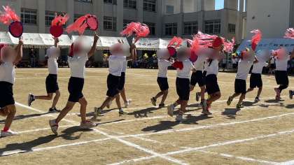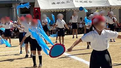2年生の団体演技「どどっとハッピー!優勝ダンス」です。うちわのヒラヒラをとても綺麗になびかせて踊っていました。素敵でした。