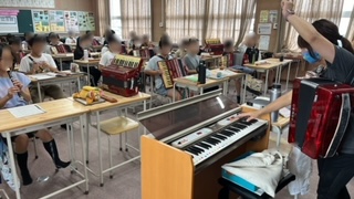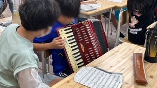 音楽の学習です。アコーディオンの練習をしていました。二人一組で交互に練習していました。
