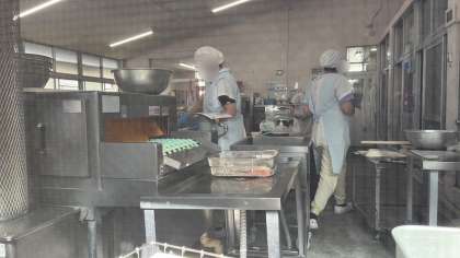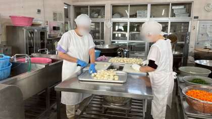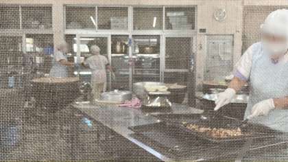 美味しい匂いに誘われて給食調理室を覗きました。給食調査員さんは600人近くの給食を作るので一所懸命頑張ってくれていました。ありがとうございます♪