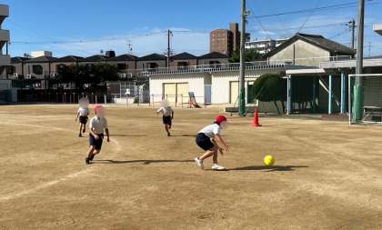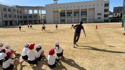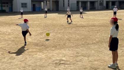 体育の学習です。ベースボール型のゲームをしていました。今日が初日のようで、ゲームのルールや投げ方、蹴り方など先生の説明付き実演を見た後、試してみていました。