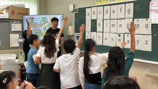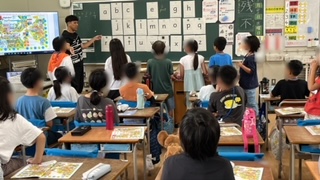 英語学習です。アルファベットを憶えるため、班対抗のクイズ合戦をしていました。抜けているアルファベットの文字を当てます。盛り上がっていました。