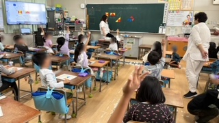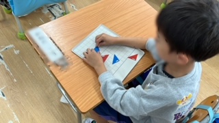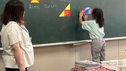 算数で、三角形をいくつか使って図形をつくる学習をしていました。できたら、黒板で発表していました。