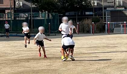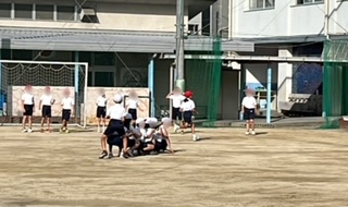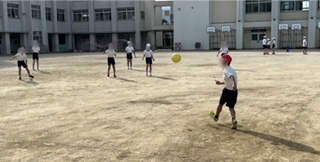 体育の学習で、ベースボール型ゲームをしていました。蹴ったボールをキャッチしてその場に守備陣が集まる間にベースを回って得点するゲームです。一人ひとりのキック力もさることながら、守備の際のチームプレイなどが大切なゲームです。
