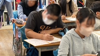 英語学習の様子です。動画を見てプリントの問題に解答する学習でした。聞き逃さないよう集中して聴いていました。