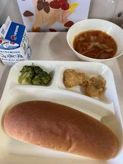 今日の献立は、白身魚のフリッター、ミネストローネ、ブロッコリーのサラダ、黒糖パン、牛乳です。いただきます。