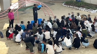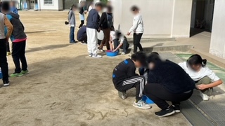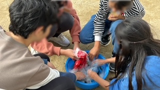 家庭科の学習で、洗濯実習をしていました。学年合同でした。全体で説明を聞いた後、各班に分かれて体育で使っているビブスを洗いました。ちょっと洗剤が多かったかな、泡立ちすぎのところもありました。
