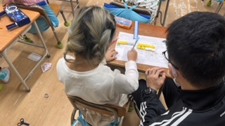 算数の学習です。足し算で答えが二桁になる計算です。片一方の数をわかりやすく分解して計算する方法を考えていました。ブロックという具体物を動かして、目で確かめながら計算を順序に従って進めていました。