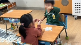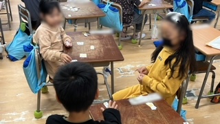 算数の学習です。足し算カードを使ってゲームをしていました。近くの友だちとカードを出し合い、和が大きい方が勝つゲームです。どのカードを出したら勝つか素早く計算しながら進めなければなりません。楽しみながら計算力が磨かれます。