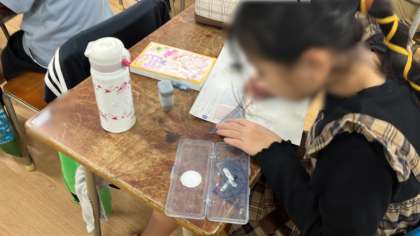 算数の学習です。黒板に貼った二つの四角形の大きさを比べる課題に取り組んでいました。それぞれの四角形に一辺1cmの正方形がいくつ入るかで考えていました。