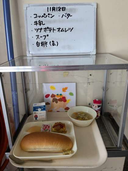 今日の給食は、ツナポテトオムレツ、ケチャップ、スープ、白桃(缶)、バター、コッペパン、牛乳です。午後からも元気に活動できるよう、しっかりといただきましょう。