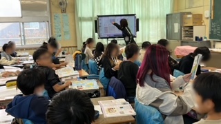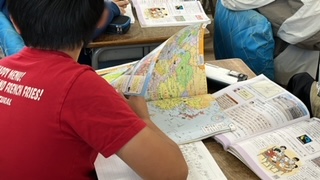 社会科の学習です。日本の貿易について学んでいました。地図を広げながら話を聴いていました。