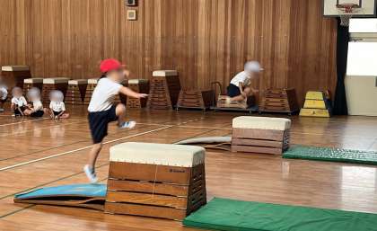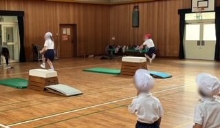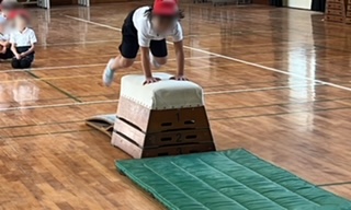 体育の学習で、跳び箱あそびをしていました。ジャンプして跳び箱の上に乗ったり、手をついて一旦、跳び箱に座ったり、跳び箱運動へ繋がる動きを楽しんでいました。