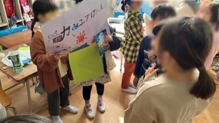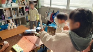 1・2年生のオモチャランドの取り組みです。2年生が班で考えて作ったオモチャで1年生をもてなします。