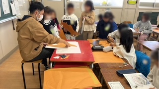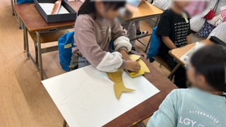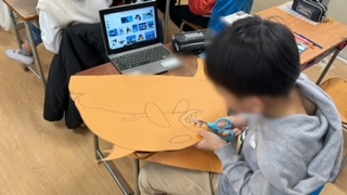 図工の学習です。紙版画に取り組んでいました。海の生物が題材のようです。型の大枠ができたら先生にアドバイスをもらいに行っていました。