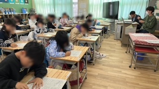 5年生の様子です。理科のテストに取り組んでいました。流れる水のはたらきの単元です。頑張って!