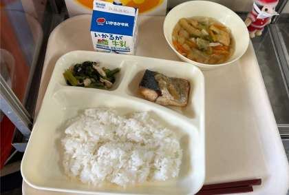 今日の献立は、サバのおろし醤油かけ、五目汁、小松菜の煮びたし、ご飯、牛乳です。とてもおいしそうですね、いただきます。