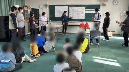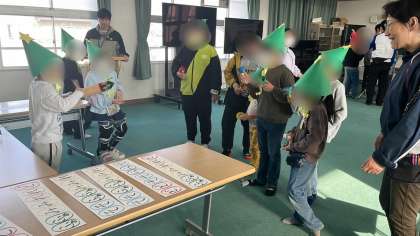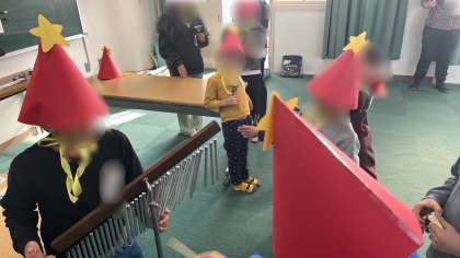 今回のきぼう集会は、ハンドベルやギギ、カスタネットなどを使って「キラキラ星」の合奏に挑戦しました。赤帽子チームと緑帽子チームに分かれて練習しました。