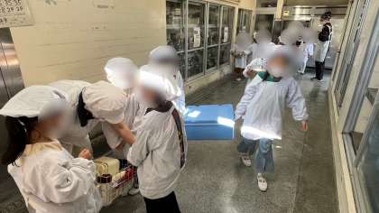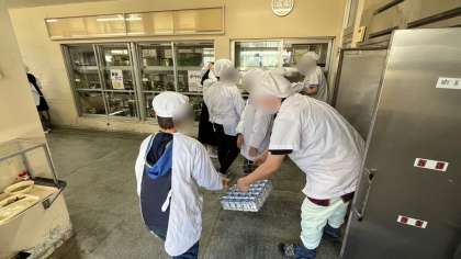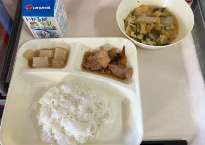 今日の献立は、鶏肉の甘辛焼き、味噌汁、大根の煮物、ご飯、牛乳です。こぼさないよう気をつけて運びましょう。いただきます!