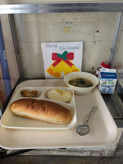 今日の献立は、さけのマリネ、肉だんごと押し麦のスープ、りんご、おさつパン、牛乳です。