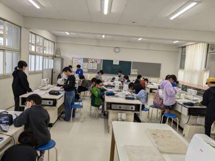 みんな、真剣そのもの。丁寧に縫う姿がみれました。出来上がりが楽しみです。来年度、修学旅行でみんな使用できますね。