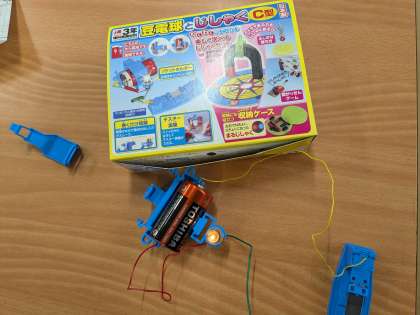 豆電球の勉強をしていました。キットを使って、豆電球を光らせます。スイッチを入れると、豆電球が点きます。みんな「先生〜、豆電球ついたよ〜!みて〜!」と嬉しそうでした。