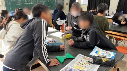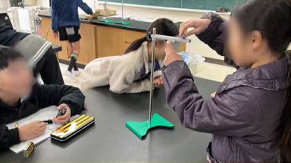 理科の振り子の学習です。振り子の紐の長さを変えて一定時間に振れる回数を記録する実験をしていました。