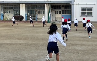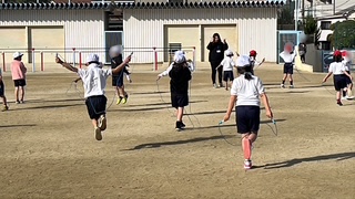 体育の学習です。持久走でトラックをしっかり走っていました。最初のうちにどうしてもスピードを出して走ってしまい、後半、ばてている子が多かったです。授業の後半は縄跳びの技に挑戦していました。