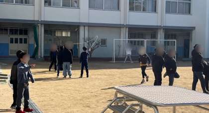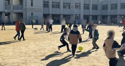 寒い中、少し日差しが暖かく感じる運動場です。たくさんの子どもたちが元気よく遊んでいました。