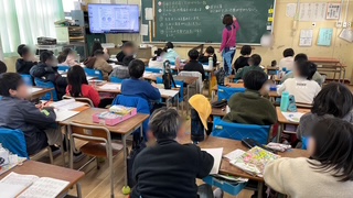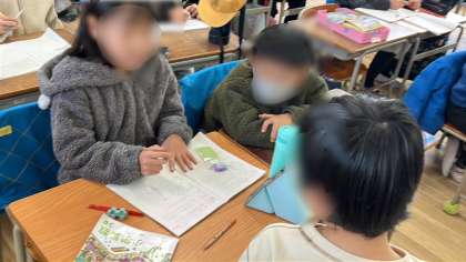 算数の学習です。「先生はシールを集めています。」「◯◯さんから7枚シールをもらいました。」「シールは全部で23枚になりました。」このお話でわからない数を□で表して式に表そうと考えていました。学年が上がっていくとともによく出てくる文字式の初歩です。班で話し合ったり、先生にアドバイスしてもらったりしながら自分の考えを深めていました。