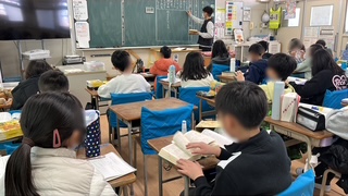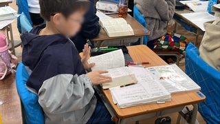 国語の学習でした。教科書の文章に出てくる言葉の意味を国語辞典で調べていました。辞典に載っている説明の中で、どの説明が合致しているのかは文章の内容をある程度でも理解していなければなりません。ただ辞典をひくだけでなく、調べた意味の中から言葉が出てきた文章により合致している意味を選ぶことができる練習をしていました。